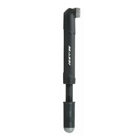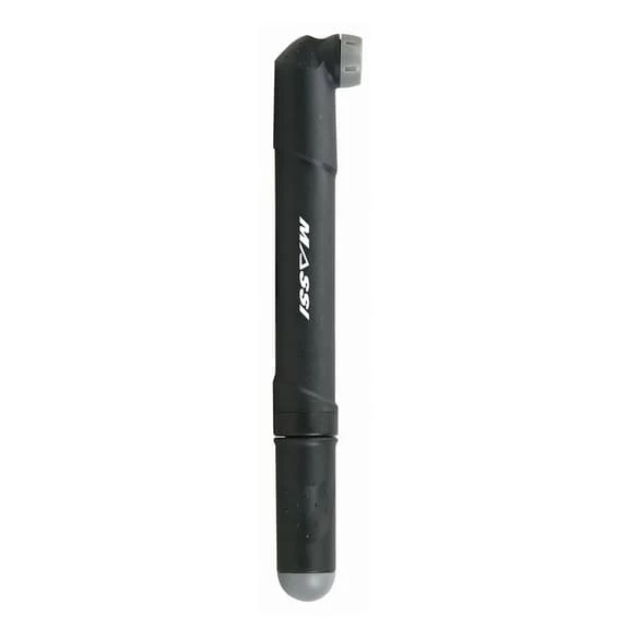 Pompa Massi 10 con doppia valvola con corpo di plastica rinforzato e terminale in alluminio. Per valvole Presta e Schrader. Fissaggio in velcro.