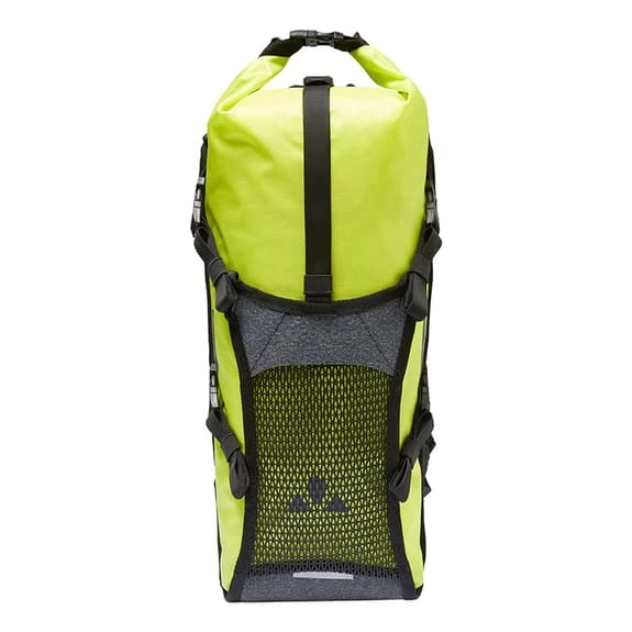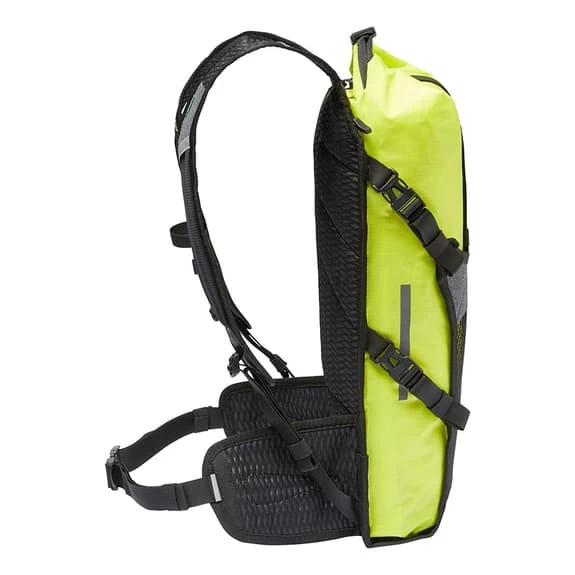 Lo zaino Vaude Trailpack II, con 8 litri di volume, è impermeabile e molto versatile, con una gamma illimitata di usi. È buono sia per il bikepacking che per il gravel, ed è perfetto come zaino per tutti i giorni. Lo scomparto principale è impermeabile al 100%, saldato e ha una chiusura roll-top. Si attacca nella parte inferiore della schiena e ai lati in modo che l’attrezzatura aggiuntiva o uno zaino idrico da 2L possano essere conservati nello spazio in alto. Dietro la patta anteriore, con due cinghie di compressione, c’è spazio per un casco, un gilet o altre attrezzature. Gli oggetti di valore possono essere conservati in modo sicuro nella piccola tasca con zip sul retro. Le stampe riflettenti sulla parte anteriore e sui lati dello zaino aumentano la visibilità in condizioni di scarsa luminosità. Sia lo scomparto principale impermeabile che la patta frontale sono realizzati con materiali riciclati al 100%. Il materiale riciclato del Trailpack II, certificato bluesign, è lavorato con il trattamento ecologico e idrorepellente Eco Finish senza l’uso di fluorocarburi (PFC).